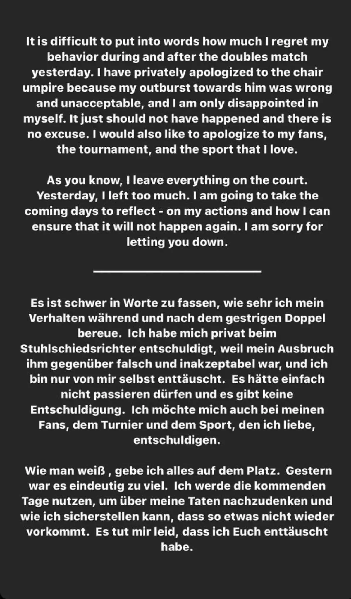 "Es difícil explicar con palabras lo mucho que me arrepiento por mi comportamiento durante y después del partido de dobles de ayer. Me disculpé en privado con el juez de silla porque mi arranque contra él fue erróneo e inaceptable, estoy decepcionado conmigo mismo. Esto no debería haber ocurrido y no hay excusa", aseguró.