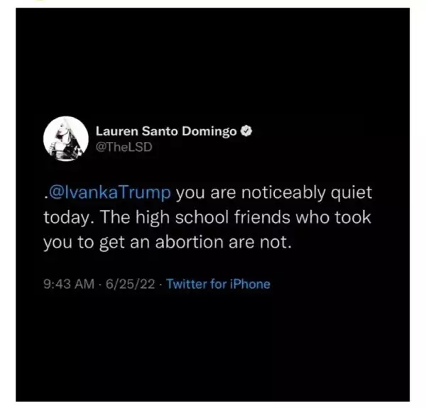 Bien dicen que una vez que algo se publica en internet no hay poder humano que pueda ocultarlo y esto se confirmó cuando la socialité y empresaria estadounidense Lauren Santo Domingo publicó un mensaje en Twitter, que desde entonces fue eliminado, en el que etiquetó Ivanka Trump sobre el hecho de que la hija del ex presidente de Estados Unidos habría sido beneficiada de la ley que aseguraba el derecho al aborto legal en dicho país, cuando sus amigas de preparatoria la acompañaron a que se practicara uno.