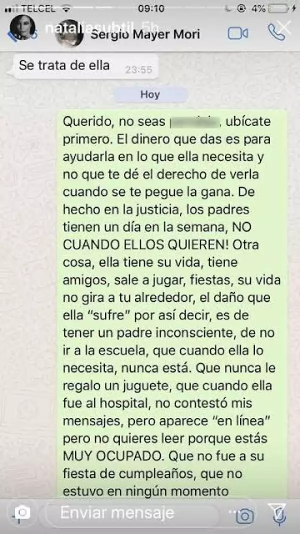“El daño que ella ‘sufre’, por decir así, es de tener un padre inconsciente, de no ir a la escuela, que cuando ella lo necesita nunca está. Que nunca le regala un juguete, que cuando ella fue al hospital no contestó mis mensajes...”, dice Natália al final de la discusión.