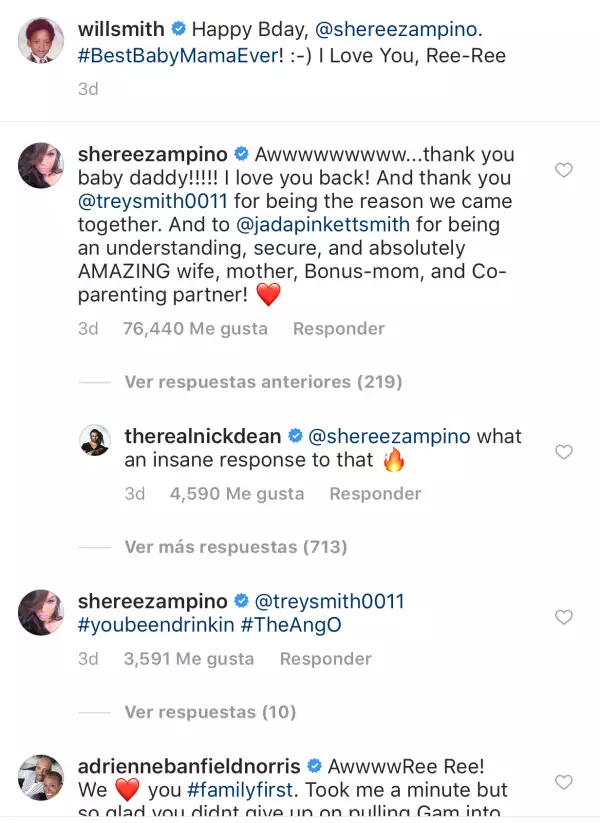 "Awwwwwwwww, gracias al papá de mi bebé. Yo también te quiero", le ha respondido la cumpleañera. "Y gracias a @treysmith0011 por ser la razón que nos unió. Y @jadapinkettsmith por ser una esposa, una madre y una mama-bonus comprensiva, segura de sí misma y maravillosa, y nuestra compañera de crianza".