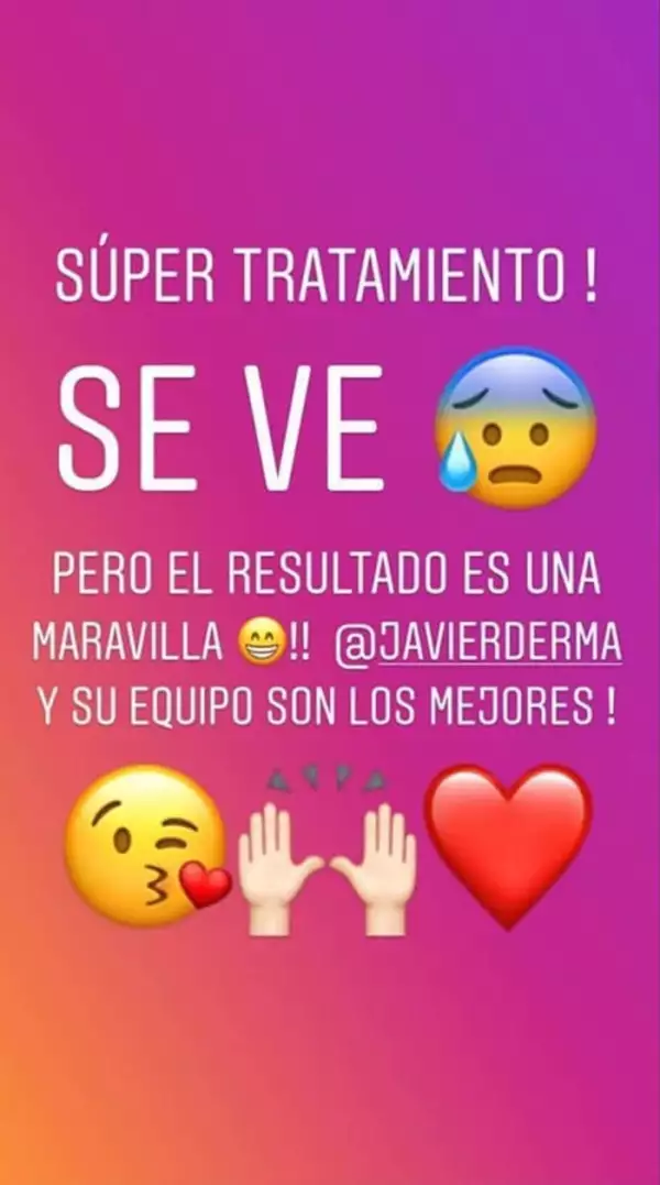 “Súper tratamiento! Se ve (emoji que expresa dolor) pero el resultado es una maravilla:)!! @javierderma y su equipo son los mejores!".