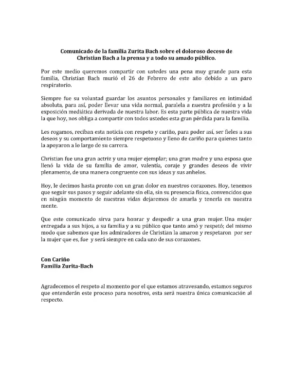La actriz Christian Bach falleció el 26 de febrero debido a un paro respiratorio de acuerdo con un comunicado difundido por la familia Zurita-Bach.