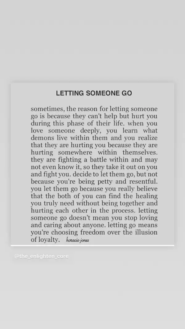 "A veces el motivo por el que tienes que dejar que alguien se vaya es porque no pueden evitar hacerte daño en esa fase concreta de su vida. Cuando amas a alguien tan profundamente, conoces los demonios que viven dentro de ellos y te das cuenta de que te hieren porque se están haciendo daño a sí mismos en su interior. Libran una batalla interna y puede que ni lo sepan, así que lo acaban pagando contigo", dice una extracto de la cita del escritor que la intérprete compartió.