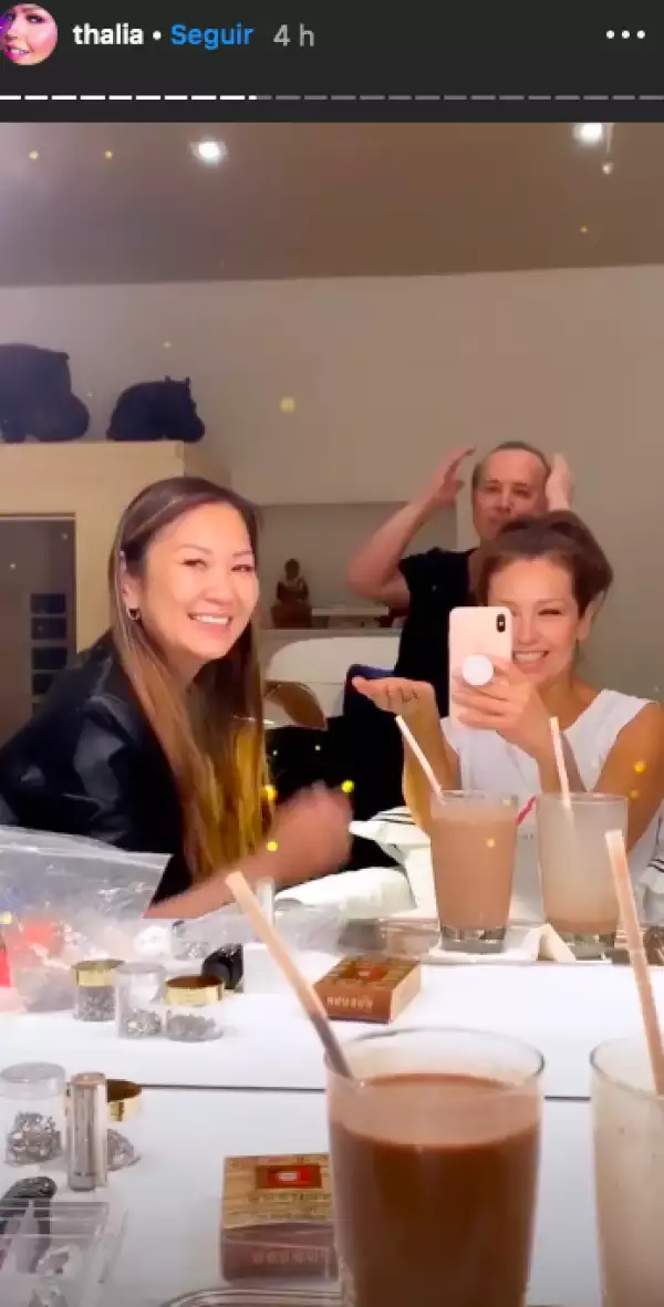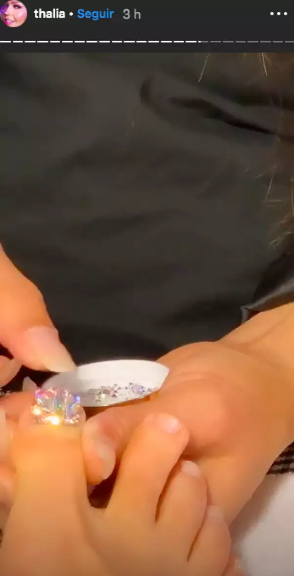 Este día, la cantante mexicana compartió en la sección de stories de Instagram un par de videoclips en los que se encuentra en compañía de su esposo, Tommy Mottola y la reconocida artista de uñas Jenny Bui. En dichos clips se aprecia que Bui le está haciendo un diseño con pedrería ls tanto en las uñas de las manos como de los pies.