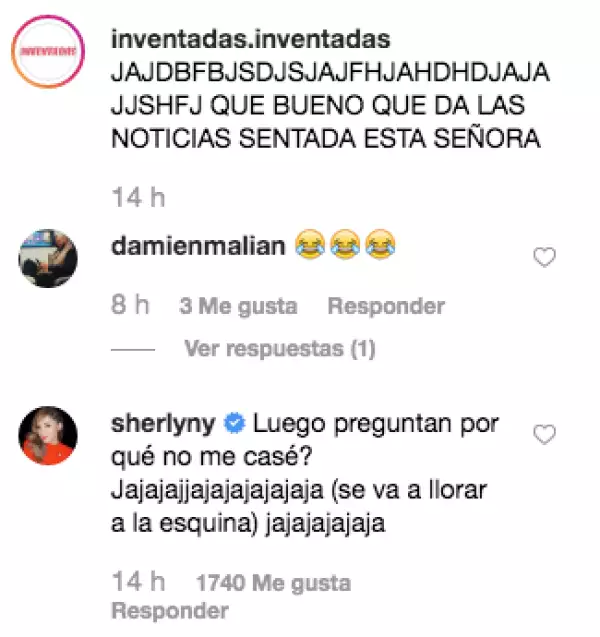 El comentario recibió muchas reacciones, entre ellas la de Sherlyn, quien se burló de su expareja: “¿Luego preguntan por qué no me casé? Jajajajajajajajaaja (se fue a llorar a la esquina) jajajajaja”, escribió la actriz, quien al parecer por el momento está soltera.