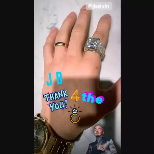 El responsable de sorprenderle con esa joya ha sido nada más y nada menos que el cantante colombiano J Balvin, a quien el joven quiso darle públicamente las gracias a través de esa plataforma. En la imagen que ha publicado de la última incorporación a su colección de piedras preciosas, que él ha elegido lucir en el dedo índice de la mano izquierda junto a su alianza de casado, solo ha escrito un mensaje de apreciación en letras de colores y eso ha sido todo.