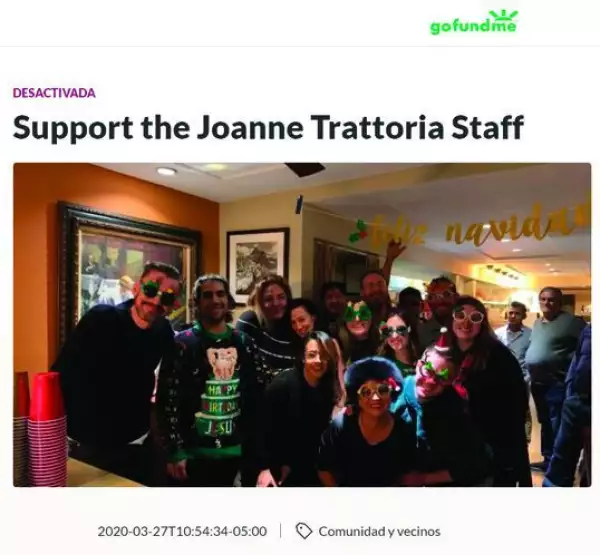 "Nuestra meta de 50 mil dólares cubriría la nómina típica durante aproximadamente 2 semanas, y el 100% de las ganancias irían a nuestros trabajadores para proporcionarles los artículos necesarios, como alimentos, cuidado de niños y gastos médicos", expresó Joe Germanotta en el portal a través del cual hizo pública la iniciativa para reunir los recursos.