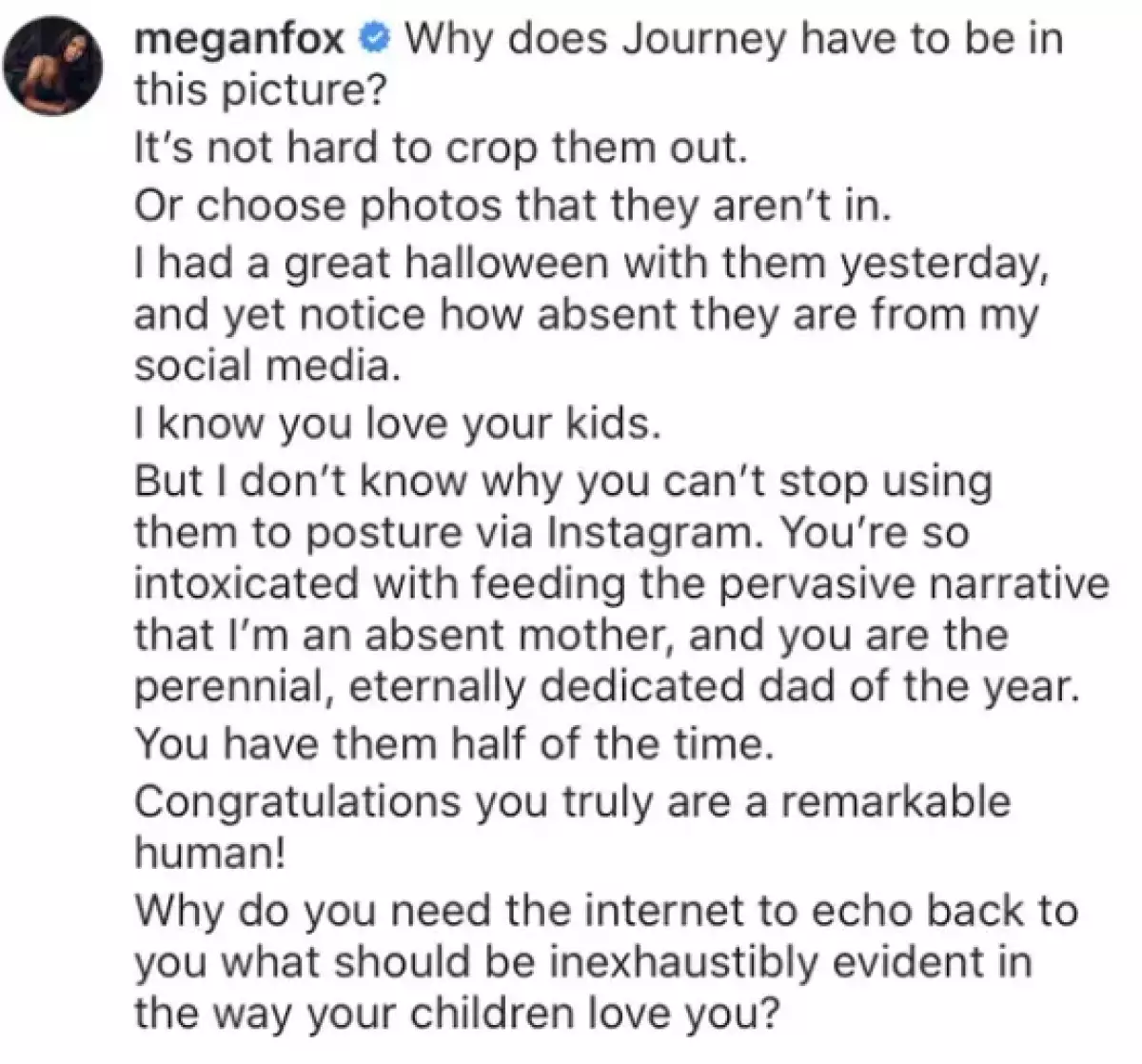 "Están contigo la mitad del tiempo. ¡Felicidades! Realmente eres un ser humano extraordinario. ¿Por qué necesitas que internet te repita lo que debería ser evidente por la forma en la que quieres a tus hijos?", añadió la intérprete, que también quiso dejar claro que ella tuvo la oportunidad de celebrar Halloween con sus pequeños por adelanto. "Te darás cuenta de que eso no aparece en mis redes sociales", añadió.