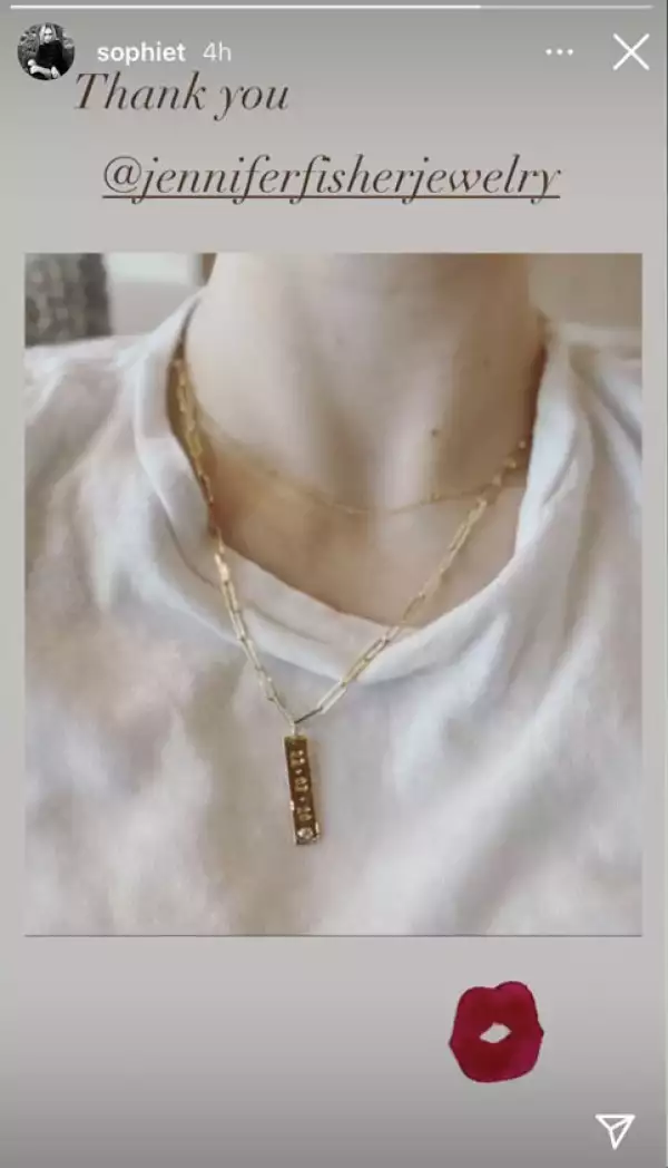 Ahora la antigua estrella de Game Of Thrones reveló la fecha exacta en que llegó al mundo su pequeña Willa por medio de una imagen publicada en sus Stories de Instagram para darle las gracias a la diseñadora Jennifer Fisher por regalarle un collar de oro con un colgante en el que aparecen los números 22-07-20.