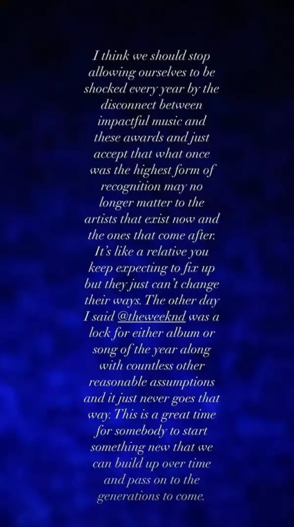 "Creo que deberíamos dejar de sorprendernos e indignarnos tanto con lo que pasa todos los años en los Grammy, con esa desconexión total entre la música que más ha impactado al mundo y el reconocimiento que debería recibir de la academia. Simplemente tenemos que aceptar que lo que un día fue la forma más alta de reconocimiento ya no importa a los artistas que dominan hoy la escena y a los que vendrán a continuación", escribió Drake en sus redes sociales, antes de abogar por la creación de una nueva plataforma más acorde con los tiempos y las modas que corren.