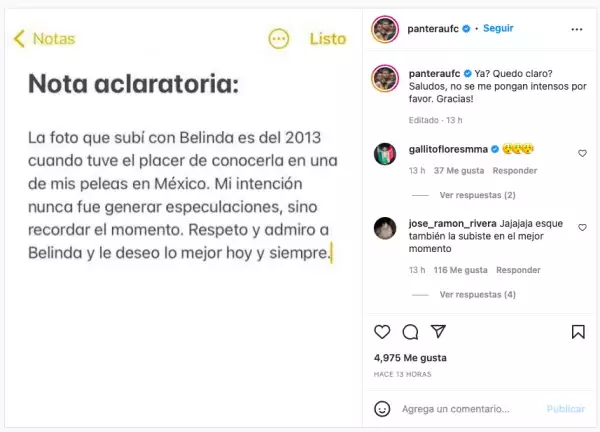 "Mi intención nunca fue generar especulaciones, sino recordar el momento. Respeto y admiro a Belinda y le deseo lo mejor hoy y siempre", afirmó a través de su cuenta. "Traumé a medio país", agregó junto a un divertido meme.