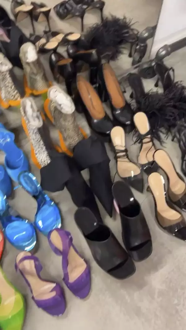 También tiene varias sandalias de tacón de plástico transparente, incluyendo un par de punta de color verde lima y sandalias de color púrpura.