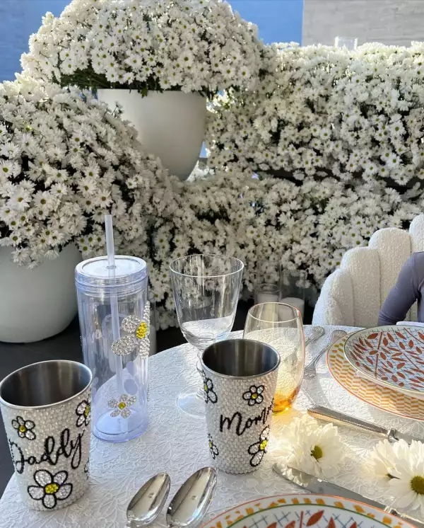 Aunque el rapero no aparece en las fotos, Kylie Jenner mostró el lugar decorado con cientos de margaritas blancas y los vasos con pedrería en los que se leen las palabras “Mommy” y “Daddy”, además de las imágenes en las que aparece su hija en el lugar.