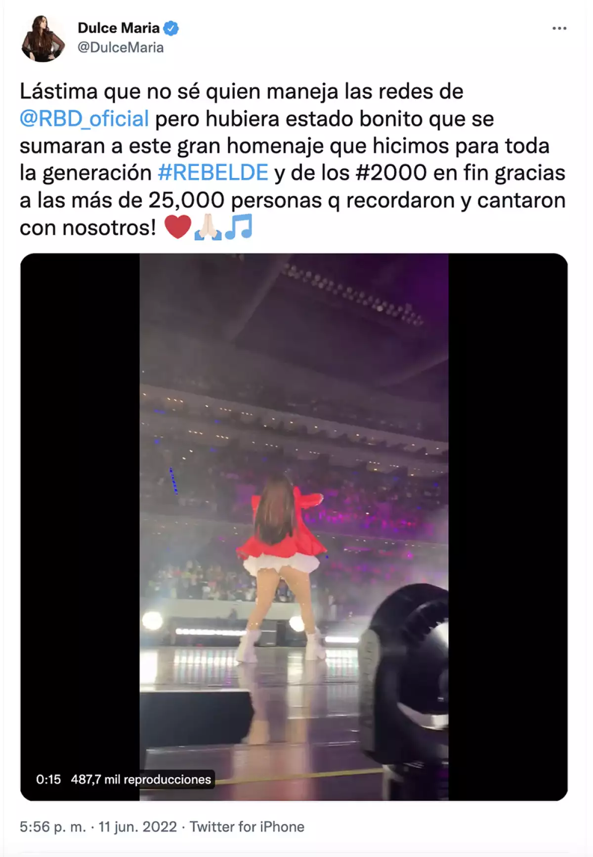 El asunto inició cuando Dulce María se quejó el sábado por la tarde, en su cuenta de Twitter, que la persona que maneja las redes sociales de RBD la ignoró y no hizo eco del homenaje que la cantante hizo al grupo durante su aparición en el 2000’s Pop Tour que se llevó a cabo el viernes en la Arena Ciudad de México.