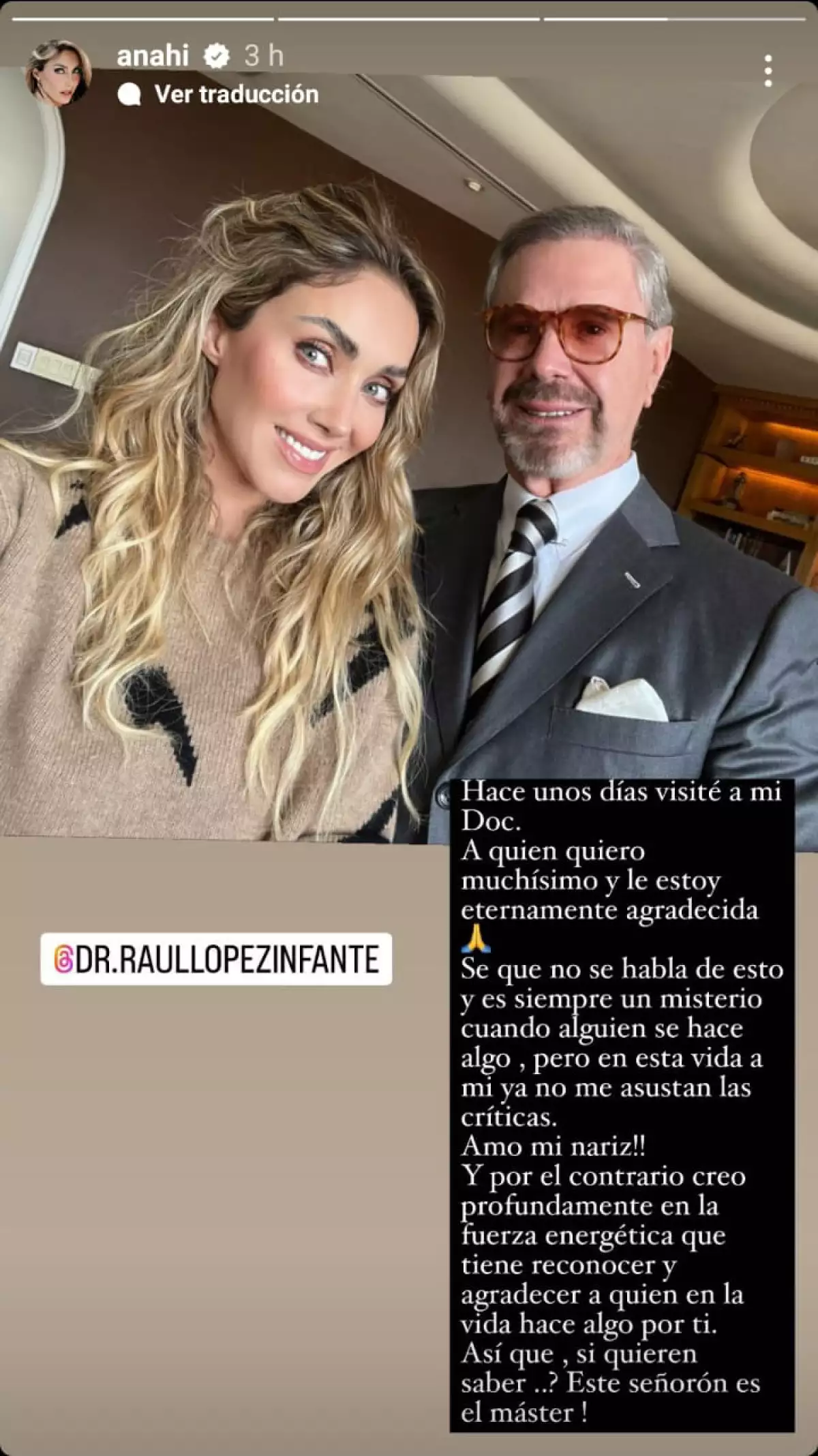 En el mensaje que escribió Anahí en sus redes sociales, aprovechó para mostrar su agradecimiento al Dr. López Infante y, de paso, hacerle un poco de promoción.