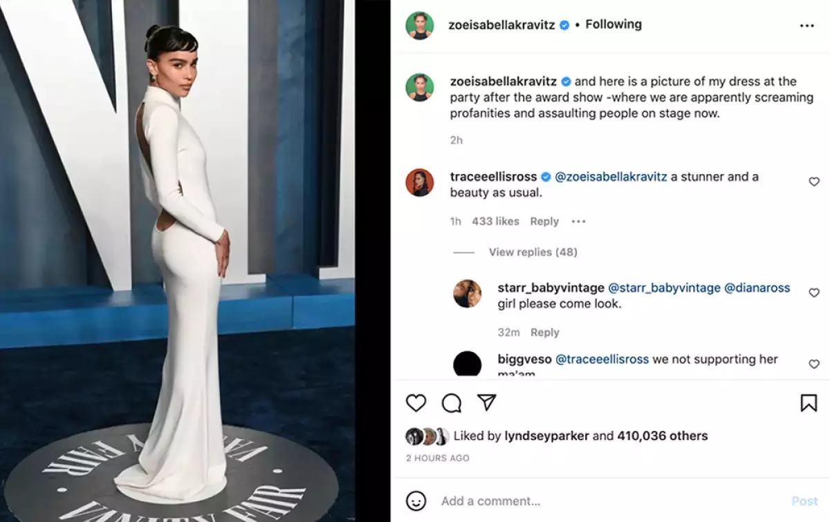En aquel momento, la actriz de película The Batman publicó una foto en Instagram de ella misma en la fiesta de los Oscar de Vanity Fair y escribió: "Y aquí hay una foto de mi vestido en la fiesta después de la entrega de premios –donde aparentemente estamos gritando groserías y agrediendo a la gente en el escenario ahora".