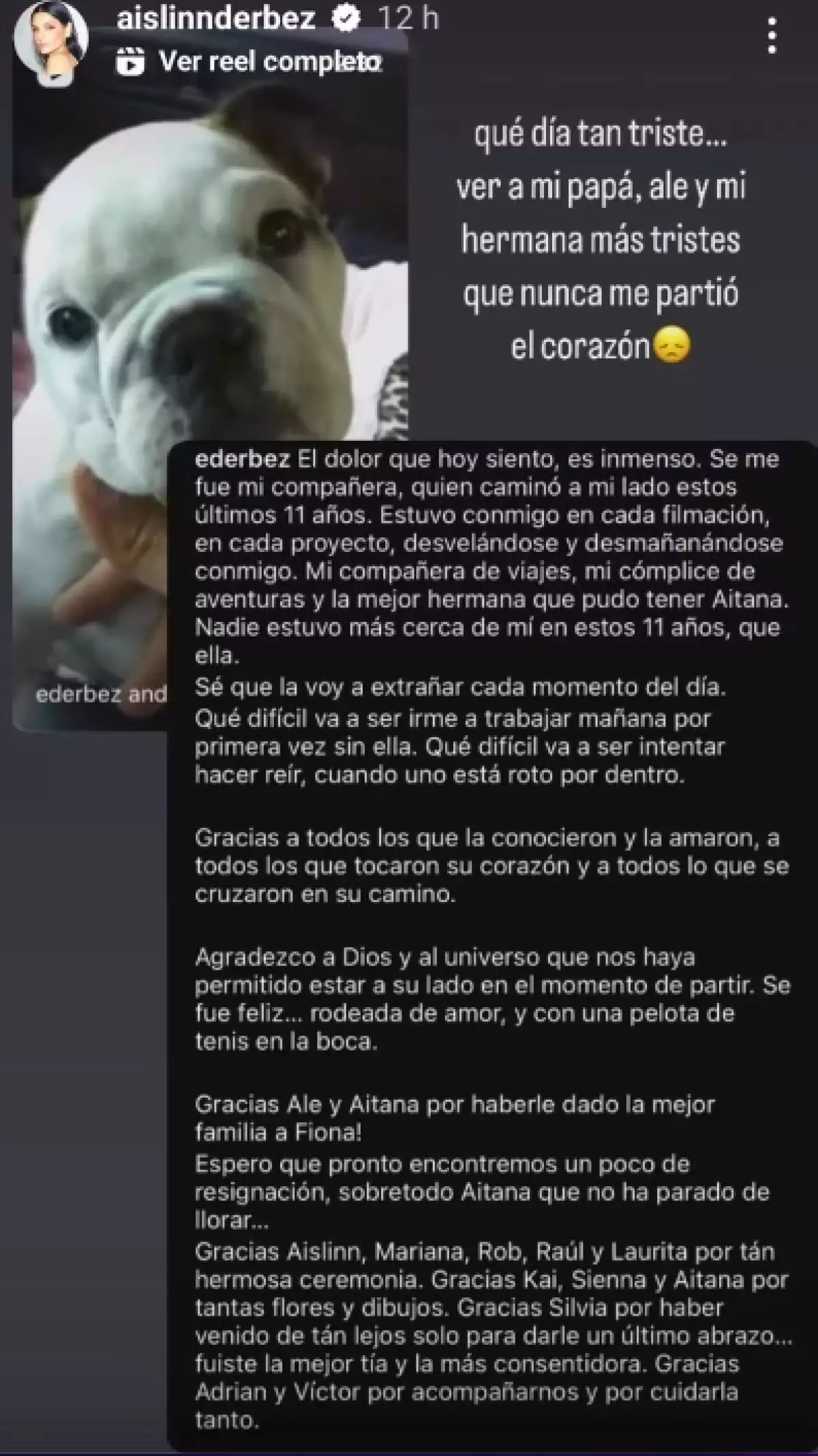 “El dolor que hoy siento, es inmenso. Se me fue mi compañera, quien caminó a mi lado estos últimos 11 años. Estuvo conmigo en cada filmación, en cada proyecto, desvelándose y desmañanándose conmigo. Mi compañera de viajes, mi cómplice de aventuras y la mejor hermana que pudo tener Aitana. Nadie estuvo más cerca de mí en estos 11 años, que ella”, comenzó el mensaje de Eugenio Derbez.