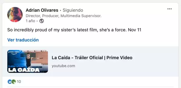 En 2023, en Linkedin, Adrián Olivares hizo una publicación en alusión al estreno de la película La caída, protagonizada y producida por su hermana Karla.