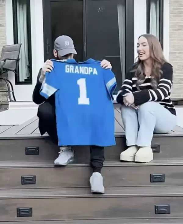 Inmediatamente después, el músico publicó un clip casero que mostraba la foto de una ecografía de un bebé que estaba oculta dentro de la camiseta de futbol, por lo que el intérprete de 'Real Slim Shady' parece conmocionado al recibir la noticia.