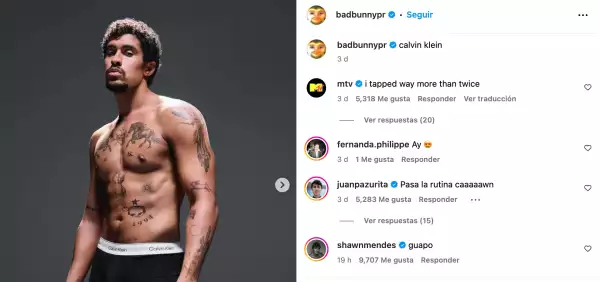 Shawn Mendes se unió a la ola de reacciones a las fotos de Bad Bunny en ropa interior de Calvin Klein, publicando un comentario en Instagram donde escribió "Guapo".