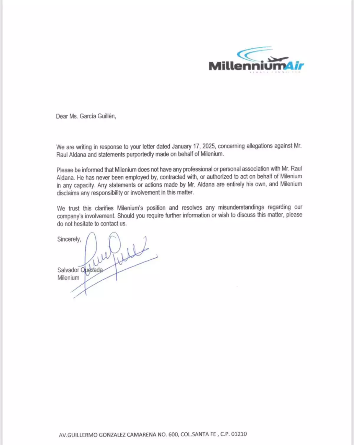 La aerolínea de vuelos privados Millennium emitió una carta en el que se deslinda de cualquier vínculo con el piloto Raúl Aldana, quien en múltiples entrevistas ha asegurado haber sido piloto personal de Luis Miguel mientras trabajaba supuestamente para dicha compañía.