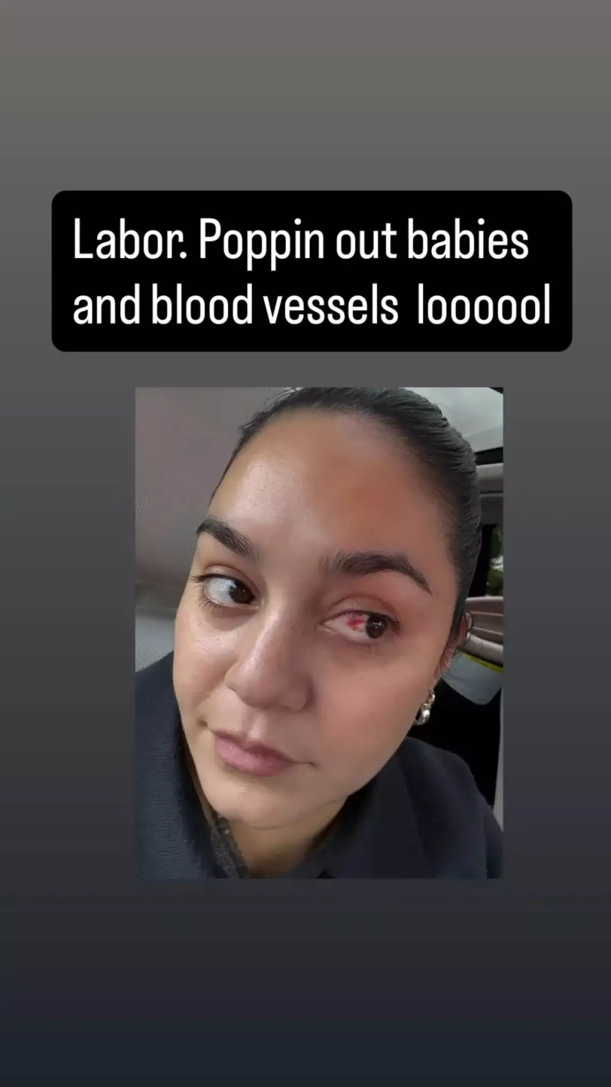 Vanessa Hudgens compartió además un momento inesperado: durante el parto se le reventó un vaso sanguíneo en el ojo. La actriz publicó una selfie en sus historias con cierto humor: “Labor: sacando bebés y vasos sanguíneos, lol”.