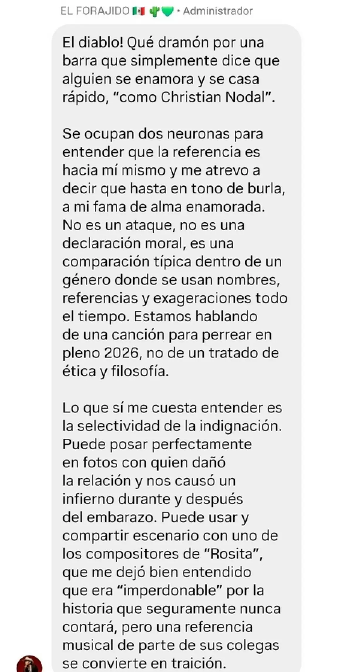 “El diablo! Qué dramón por una barra que simplemente dice que alguien se enamora y se casa rápido, “como Christian Nodal”. Se ocupan dos neuronas para entender que la referencia es hacia mí mismo y me atrevo a decir que hasta en tono de burla, a mi fama de alma enamorada. No es un ataque, no es una declaración moral, es una comparación típica dentro de un género donde se usan nombres, referencias y exageraciones todo el tiempo. Estamos hablando de una canción para perrear en pleno 2026, no de un tratado de ética y filosofía”, compartió el cantante.