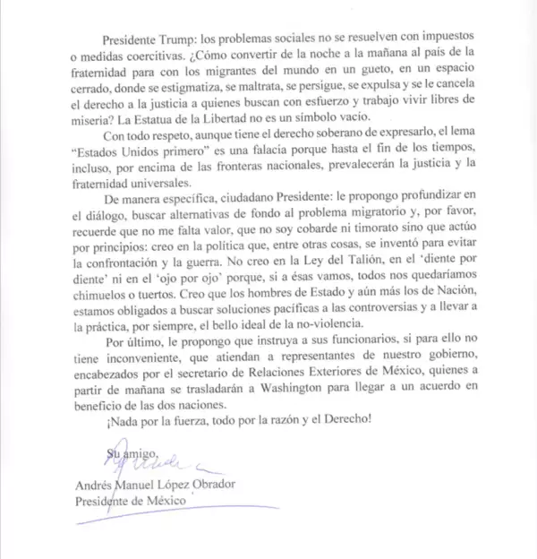 En otro párrafo de la carta se puede leer “No creo en la Ley del Talión, en el ‘diente por diente’ ni en el ‘ojo por ojo’ porque, si a esas vamos, todos nos quedaríamos chimuelos o tuertos”. Minutos después de que el documento se hizo público el Secretario de Relaciones Exteriores, Marcelo Ebrard secundó la respuesta del presidente y confirmó su próxima visita a Washington para buscar un acuerdo. “Dignidad y firmeza en esta hora difícil", finalizó.
