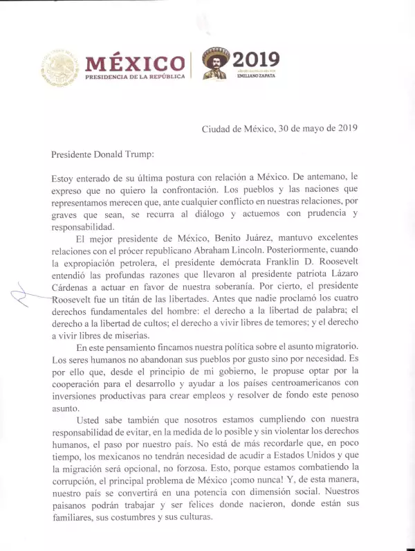 Luego de que el presidente de Estados Unidos, Donald Trump anunció que a partir del 10 de junio próximo se impondrá un arancel del 5 % a todos los productos que ingresen provenientes de México, Andrés Manuel López Obrador respondió a este mensaje a través de una carta.