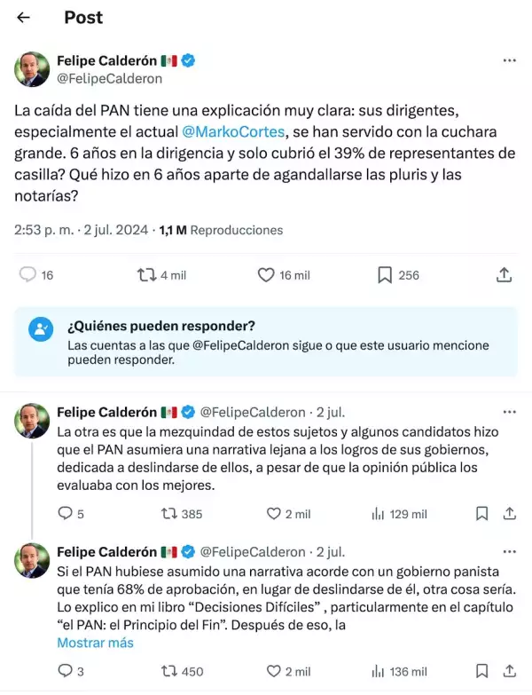 Lo cierto es que en el PAN el debate se ha encendido por nombrar a quien le ha hecho más daño al partido, y mientras que algunos militantes son directos con sus calificativos en contra de su dirigente nacional, incluido el ex presidente Felipe Calderón, el propio Marko Cortés y dirigencias estatales aseguran que fue precisamente Calderón quien desarmó al blanquiazul durante su sexenio.