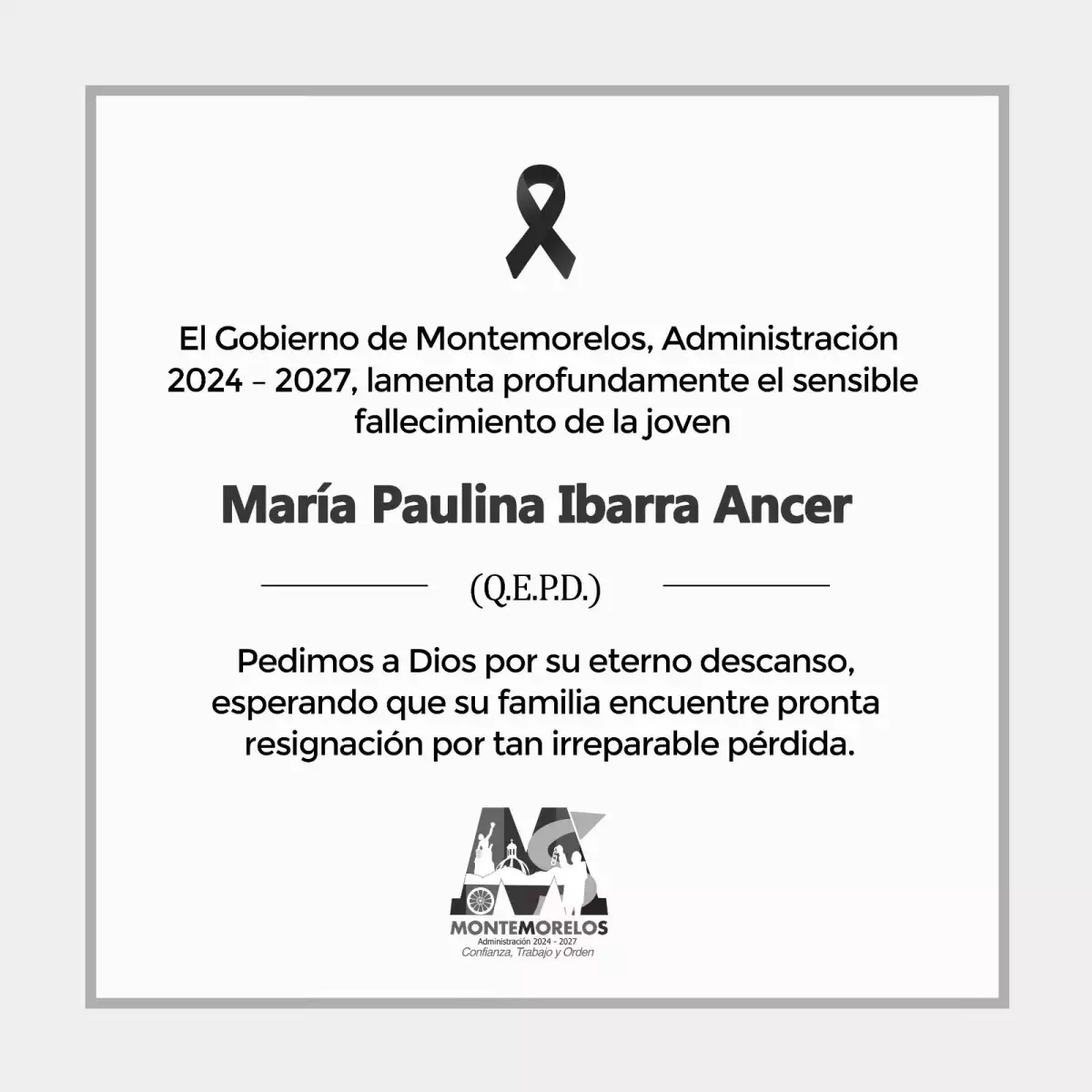 "El Gobierno de Montemorelos encabezado por el alcalde, el Lic. Miguel Angel Salazar, lamenta profundamente el fallecimiento de la Srita. María Paulina Ibarra Ancer, prima de nuestro compañero y regidor Jesús Ancer Chapa", compartió la autoridad municipal.