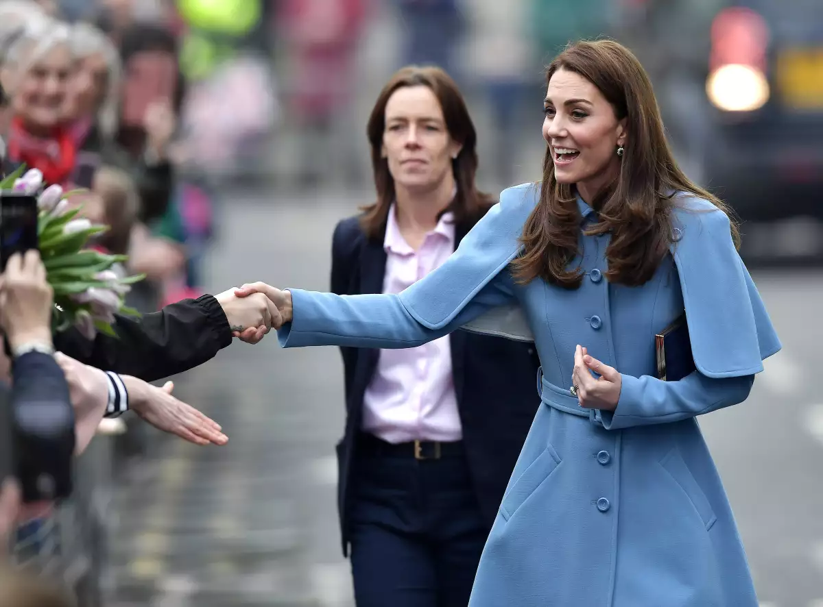 Durante la caminata, la duquesa llevó un abrigo azul cielo con una pequeña capa integrada. Como siempre, tan elegante y vestida con uno de sus colores favoritos, el azul cielo, cumplió con sus deberes y el sueño de una pequeña –a quien conoció en la organización benéfica Cinemagic–, al permitirle que le hiciera algunas preguntas personales para incluirlas en una biografía que está escribiendo sobre ella.