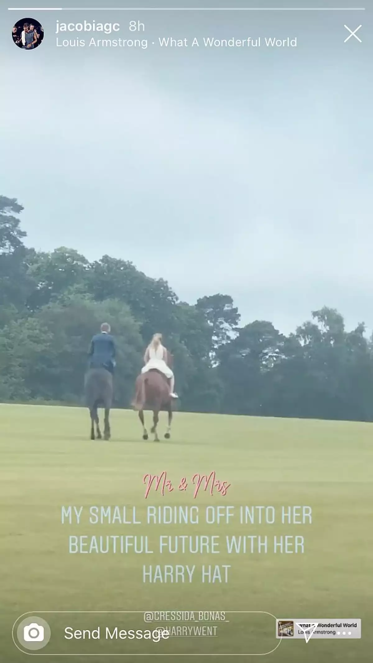 La única foto del enlace que ha trascendido hasta ahora fue gracias al hermano de la intérprete, Jacobi Anstruther-Gough-Calthorpe, que compartió en sus Stories de Instagram una imagen en la que los recién casados aparecían montados a caballo y cabalgando por el campo. En la instantánea apenas se puede apreciar el vestido de la novia, que parecía tener la espalda abierta.