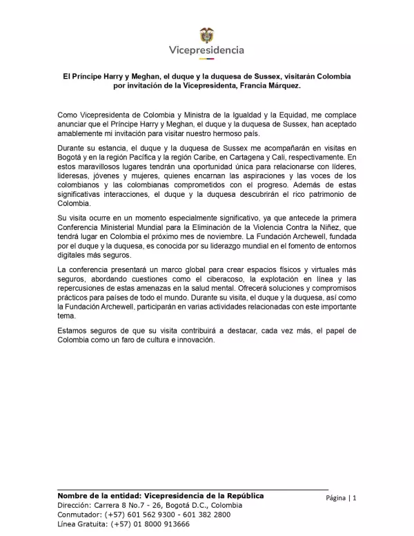 "Durante su estadía en Colombia, el duque y la duquesa de Sussex viajarán a Bogotá, Cartagena y Cali junto a Francia Márquez. “En estos maravillosos lugares tendrán una oportunidad única para relacionarse con líderes, lideresas, jóvenes y mujeres, quienes encarnan las aspiraciones y las voces de los colombianos y las colombianas comprometidos con el progreso", explica la Vicepresidencia.y también ministra de la Igualdad y la Equidad en un comunicado.